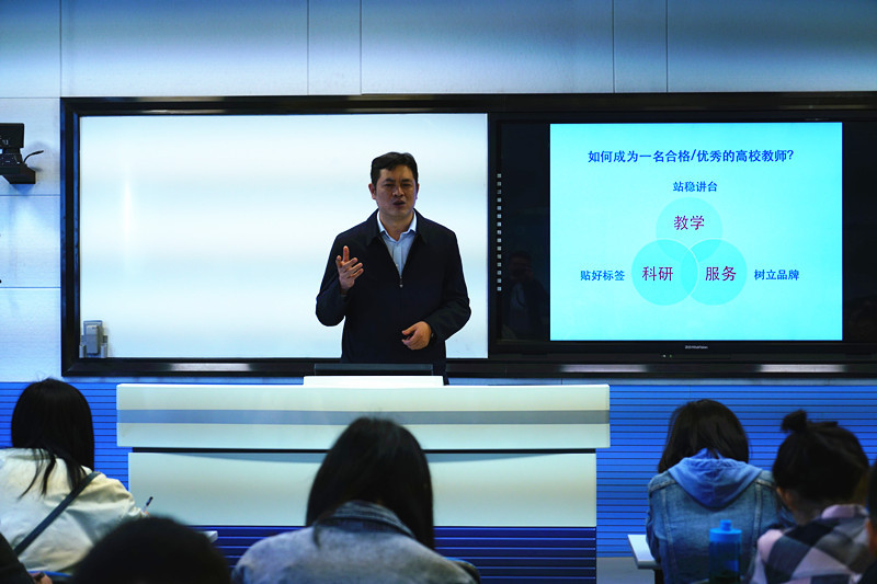 报告开始,针对当前很多青年教师毕业进入工作岗位入门难的问题,陈教授首先指出,问题的症结在于教师定位不清。大学的基本职能是科学研究、人才培养、社会服务和文化传承,所以,高校教师应当同时做好教学、科研和服务工作,概括地说,就是要做好教学工作,站稳讲台;做好科研工作,贴好标签;做好服务工作,树立品牌。之后,陈教授结合自身成长经历,就如何做好教学、科研和服务工作提出了许多中肯的建议。过好教学关,要求年轻教师不只关注课堂教学本身,还要用心把握其背后从培养方案-教学计划-教学大纲-教案-讲义与课件整个流程中的每个环节。多听课也是年轻教师提升教学水平的必要途径,观看好的或不好的课堂教学都可以起到借鉴作用。此外,严格课堂管理也是不容忽视的方面。过好科研关,要求年轻教师提前做好科研规划,选准方向,纵深推进。项目申请要独立思考,在自己已有研究的基础上紧跟前沿,找创新。重视团队协作,要主动寻找并融入团队。加强学术交流,汇报研究成果,提升自己的学术影响力。做好服务工作,要求年轻教师多一点大局观念,处理好个人发展与学院发展的关系。多一点学科视野,在掌握学科发展脉络的基础上深化自身研究。多一点奉献精神,适当参与学科、专业和课程建设,以及日常管理等工作。多一点团队意识,善于协作,共同进步。多一点服务意识,为学院和其他师生提供力所能及的服务。报告最后,陈教授以伟大的人民教育家陶行知先生的名言“学高为师,身正为范”勉励青年教师,希望青年教师立德树人,发挥课堂教学的核心价值,引导、影响学生未来的成长。