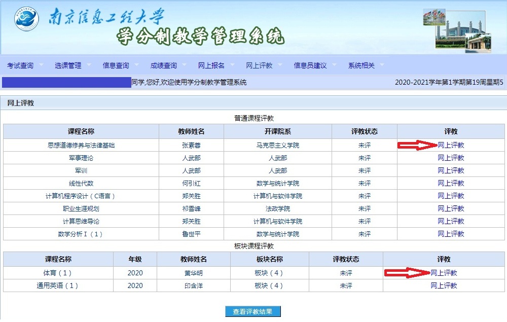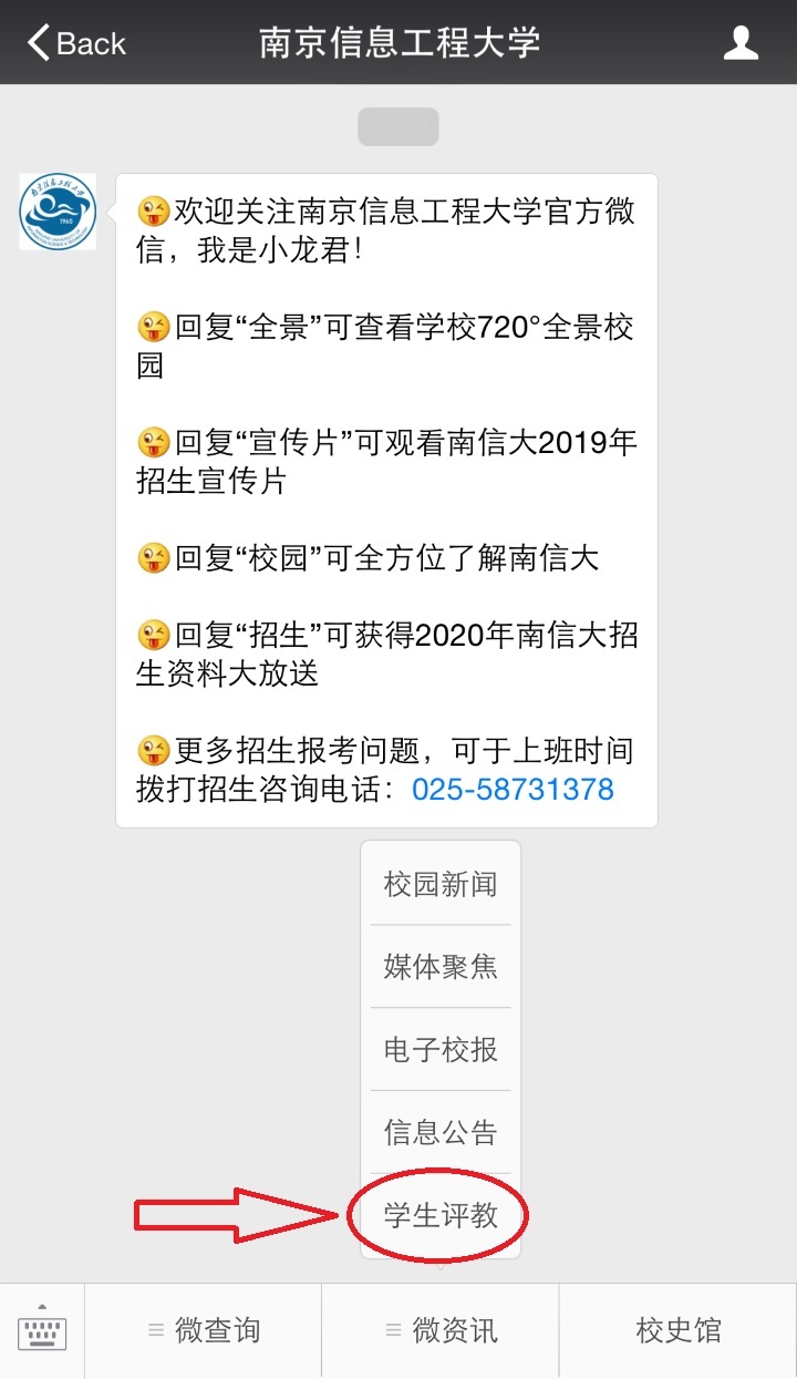 关注学校官方微信号(nuist1960),在主页“微资讯”中点击“学生评教”登录系统,进入自己的账户,对本学期所修课程分别进行评教。