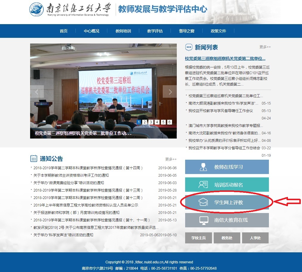 学生登录教师发展与教学评估中心网站首页(https://fdtec.nuist.edu.cn/),点击“学生网上评教”登录“学分制教务管理系统”,进入自己的账户,对本学期所修课程分别进行评教。